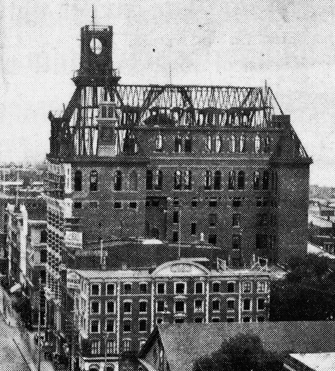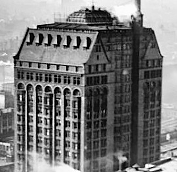 Burnham & Root, Masonic Temple. Exterior from Floor 16 to the top of the skylight. Note that the windows in the Observation Deck are open. Also note the exposed steel trussed arches that support the skylight. (Hoffmann, Root)