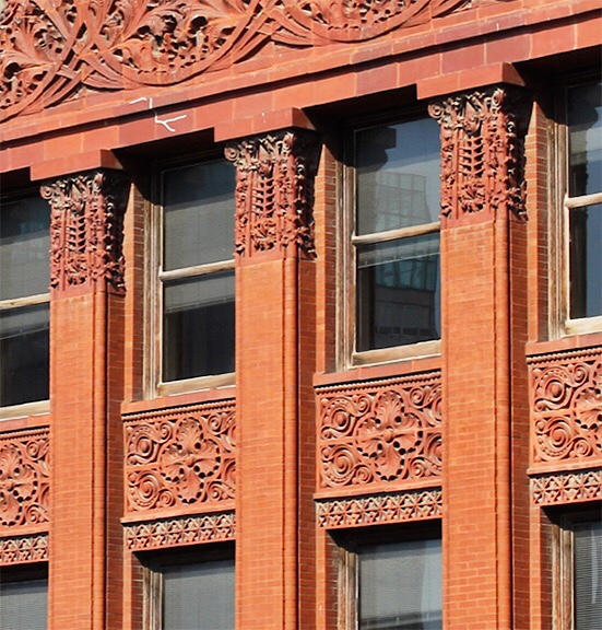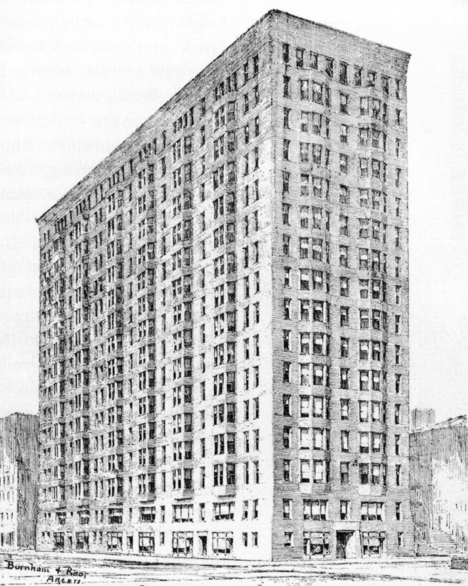 But if we really want to give credit to where credit is due, we need to remember that even earlier George Edbrooke in 1883 had used five-story unbroken piers in the Adams Express Building and seven-storied pilasters in the Hiram Sibley Warehouse.