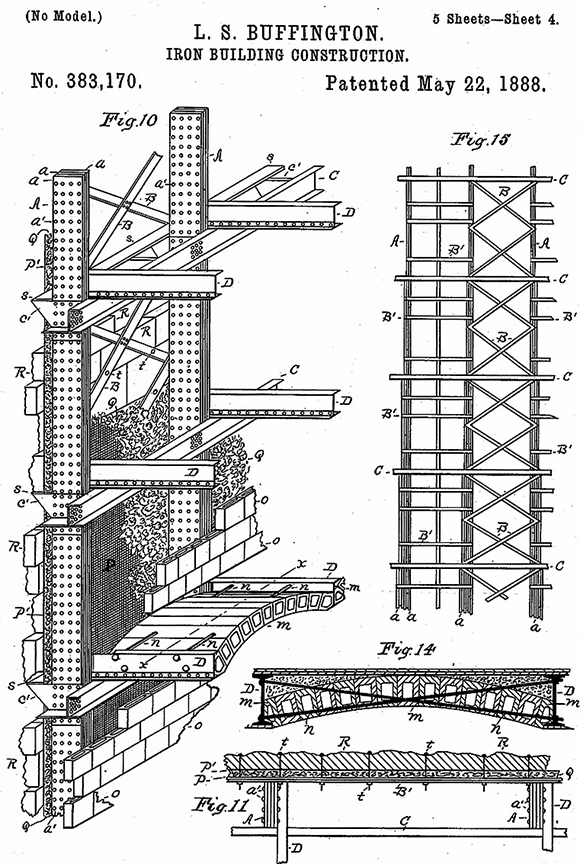 Left: E.C. Shankland, Masonic Temple. Cross section showing the configuration of the diagonal bracing. Note the total height at the top of the building reads: 302’ 1.” (Engineering Record, January 21, 1893); Right: LeRoy S. Buffington, Patent for Iron Building Construction, May 22,1888. (Online)