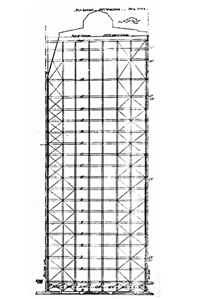 The seventeenth story was spanned by 3’ deep lattice girders that not only had sufficient depth to support the large live loads of Masonic events performed on the eighteenth floor, but also to act as tierods for the A-framed trusses that spanned the eighteenth story.