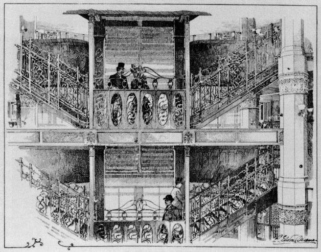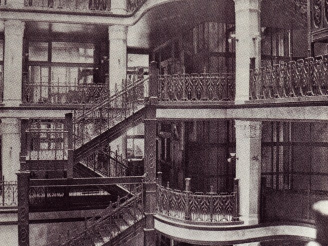 Burnham & Root, Masonic Temple. Atrium at the Second and Third Floors. Note the large panes of plate glass used in the storefronts. This photo also shows the entresol stairs stopping at the Third Floor (in the middle) and then were redirected to the center of the atrium (just visible in the right upper corner), going from the Third to the Fourth Floor, etc. (Hoffmann, Root)