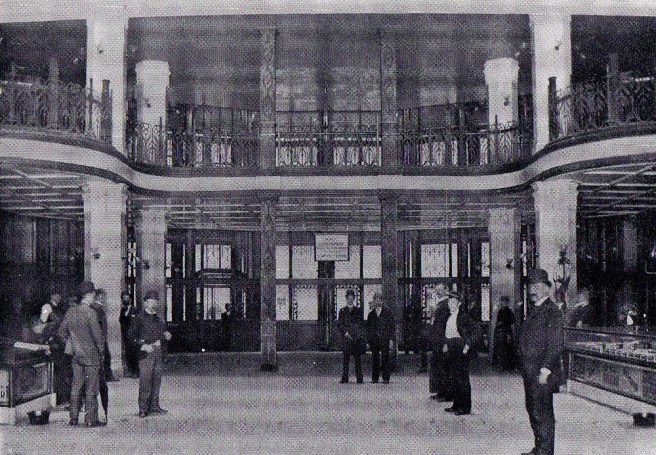 Burnham & Root, Masonic Temple. Ground Floor Rotunda. Note the windows in the wall behind the elevator shafts. The stairways to the Second Floor are at either edge of the photo, so as not to impede the direct view and route to the elevators. While the Second Floor is recessed between the two center columns, the Third Floor projects flush with the columns, creating a lower lobby for the elevator bank. (Hoffmann, Root)