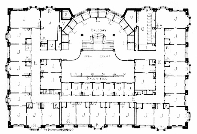 Burnham & Root, Masonic Temple. Above: Plan 18th Floor; Below: Plan 17th Floor. They were almost identical except for the exterior windows. I have dashed in the cantilevered walkways seen in the atrium photo that do not appear in these originals. It is apparent that these were added not only for privacy screening, but also to permit access to the smaller center hall without having to move through the larger halls. (Architectural Record, March 27, 1893)