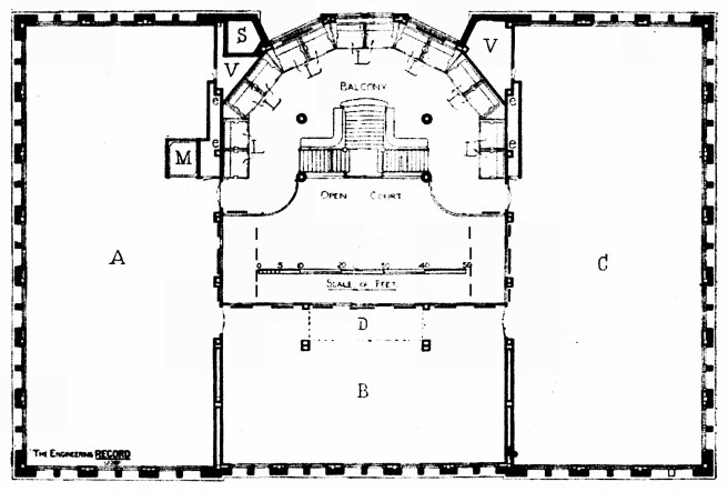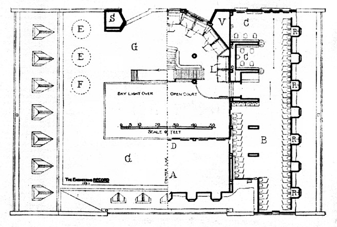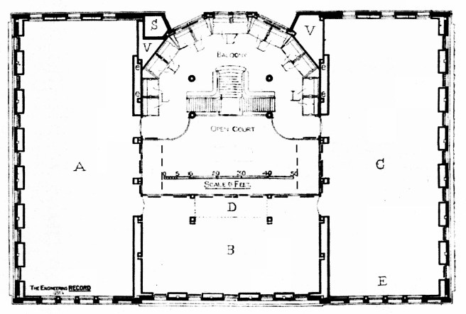 Burnham & Root, Masonic Temple. Ground Floor Plan. Note how the stairways were placed to either side, permitting an unobstructed approach to the elevators. (Architectural Record, May 13, 1893)