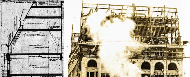 The three-story triumphal-arched entry posed a significant structural problem in that there were two columns that carried the load of the seventeen floors above the arch that had to be transferred to the sides of the arch so that the opening would be column-free. Shankland placed a 25 ton, 7’ deep by 43’ long box girder immediately above the arch to carry the column loads over to the adjacent columns. (There is some irony in having to use a seven-foot deep steel beam so that an arch with this depth would have no loads to carry except its own self-weight…) The Chicago Tribune realized that the city’s builders had invented a new “type of the American school of Architecture, the masonry is only to protect the real supports of the building, steel beams.” (Once again, there are no similar claims made in contemporary accounts of the Home Insurance Building’s construction.) I’ll take the opportunity here to point out that the Tribune had called this the “American school of Architecture,” to reinforce my argument that there were, indeed, those in Chicago during this period that were aware of, and encouraging the development of a modern style of architecture in Chicago, i.e., the Chicago School of architecture..
