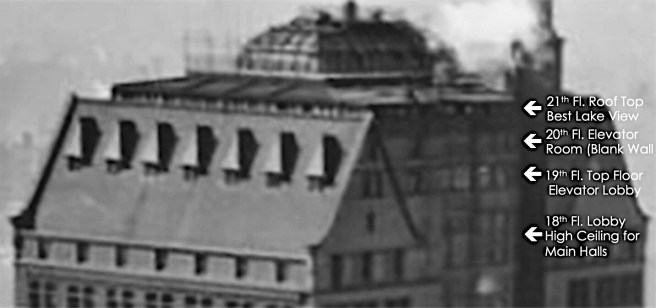 The rooms for the Masons and their secret rituals were located on floors 17-18, high above the sidewalks and completely out of sight from the non-member. The building’s floor plan had been so designed and structured to provide large, 50’ by 111’ column-free halls with capacities of 1300 people for balls and banquets on the North and the South sides of each of these floors, that were linked by a smaller hall on the West or State Street front.