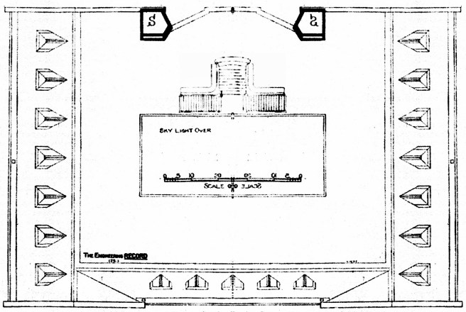 Burnham & Root, Masonic Temple. Above: Top four floors of the East (the business side) elevation. The windows on floors 18 and 19 have elevators in front of them. Floor 20 appears to have a blank wall (although the mechanical room here with the elevator equipment could have used the daylight (its hard to determine from this photo). The Obsevation Windows of the 21st Floor give an unobstructed view down to the street and out to the lake. Below: Framing sections of the skylight.