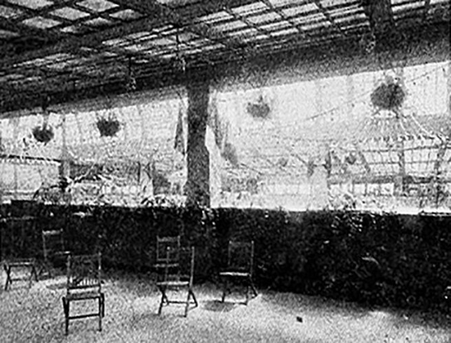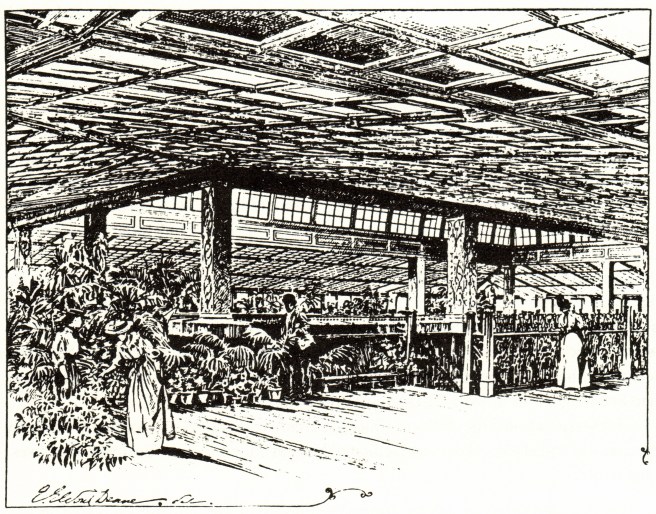 As a response to not only the success of the Auditorium’s new observation deck, but also to Madison Square Garden’s rooftop beergarden, the project’s leaders decided to make the rooftop (the twenty-first floor, as there was a mechanical space or twentieth floor squeezed in between the 19th and the roof) a combined wintergarden and observation deck. While the Chicago Hotel had a rooftop summer garden, an enclosed greenhouse would not only continue to draw paying customers year-round, but also better encourage those who were of weaker heart to experience the open-air elevator cab ride with the hope that they would come back to visit the ten floors of shopping without any reservation. There were four express elevators that whisked visitors up to the nineteenth floor, from which they would then climb up two flights of Root’s open ironwork stairway along the edge of the vast chasm that was sheathed with mirrors at this level (if the faint-of-heart didn’t lose it at this point, looking down into a 300’ deep well that at its top was lined with mirrors…) and into the artificial Garden of Eden in the sky. (During the gray, cold Chicago winter, the warm and lush world of the Observation deck would most definitely have seemed to be “heavenly,” in more then one way!)