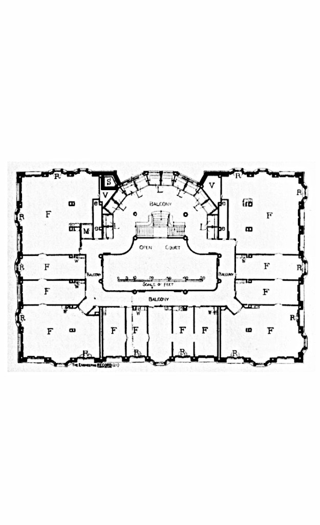 These trusses not only gave the rooms on this floor a 20.5’ high ceiling which allowed for the insertion of balconies in the vaulted ceiling, but also supported the smaller nineteenth floor.