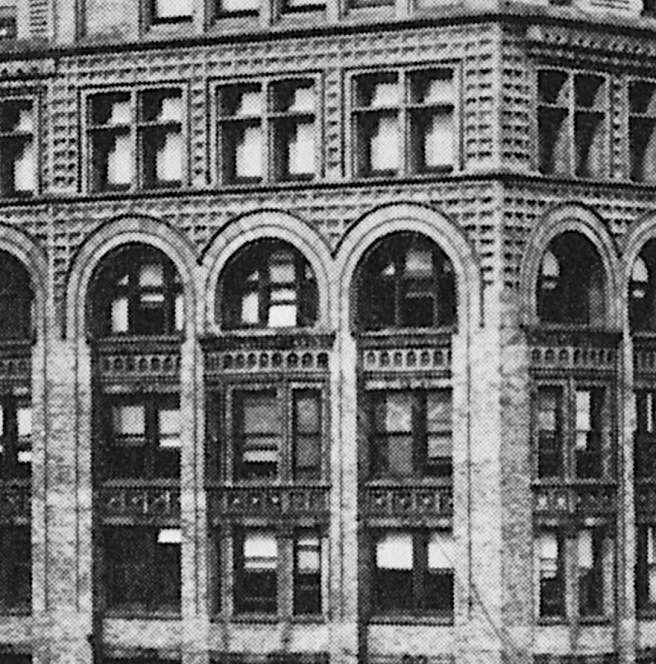 Burnham & Root, Masonic Temple. Entry arch. Note the eight low relief niches above the arch, in which were placed various Masonic symbols. This arcade hid the seven-foot deep transfer beam. (Hoffmann, Meanings)
