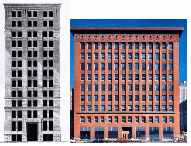 Left: Burnham & Root, American National Bank, 1886; Right: Adler & Sullivan, Wainwright Building, 1890.