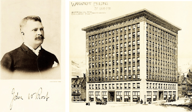 Left: Obituary photograph of Root in January 1891 Inland Architect; Right: Adler & Sullivan, Wainwright Building, St. Louis, 1890. (Inland Architect, Jan. 1891)