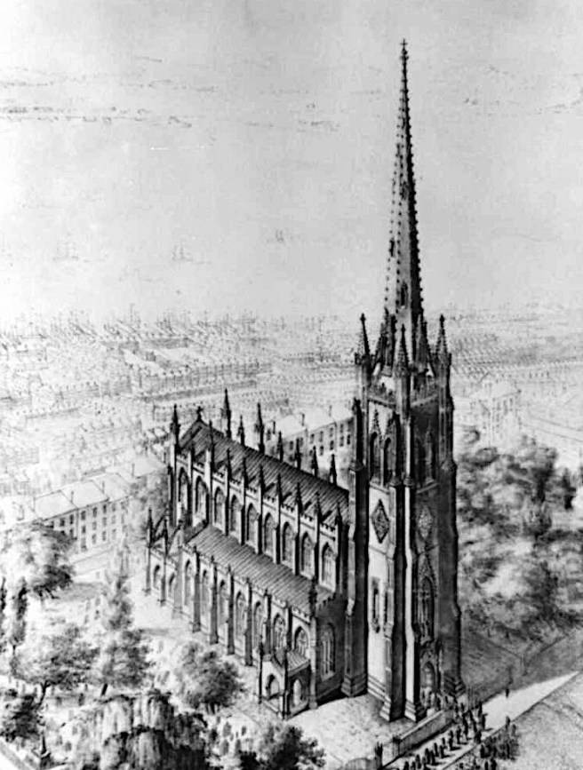 It was into this maturing architectural environment in New York City that the École-trained Richard Morris Hunt had entered upon his return to the U. S. in September 1855. On February 23, 1857, Hunt was one of thirteen New York architects, drawn from all three backgrounds of the early American architects, who met in the office of Richard Upjohn to organize the New York Society of Architects. Upjohn, who had been born in Great Britain and had apprenticed under a builder and cabinet-maker, had immigrated at the age of 27 to Boston, and eventually found work with an architect. He had moved to New York in 1839, where he was hired to redesign Trinity Church, at the foot of Wall Street. Its overall design reveals the influence of Pugin’s early writings. When it was completed in 1846, its 281’ tall spire was the tallest structure in the U.S.