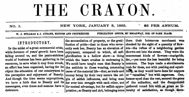 While the first U. S. edition of John Ruskin’s Modern Painters was published in 1847, the later writings of Ruskin became accessible to American designers primarily through the auspices provided by The Crayon, a magazine “devoted to the graphic arts and the literature related to them,” started in January 1855 by New Yorker William J. Stillman.