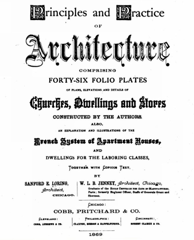 Jenney’s years in Paris obviously had expanded his insights into art, as well as life itself, and Jenney himself attributed this period as the influence for his move into architecture. But before he could find employment in the profession back in the U.S., he joined the Union Army at the start of the Civil War, serving on the engineering staffs of first Grant, and then Sherman. His skill set, therefore, included both ends of the spectrum of the profession of architecture: art and science. Upon his arrival in Chicago after the war, he found an architectural position as the junior partner of Sanford Loring. One can easily posit Jenney to have been a leader of Chicago’s nascent post-war avant-garde. In early 1869 Jenney, at the age of 37 co-authored with Loring (I give the majority of the credit to Jenney on the basis of his later writings), Principles and Practice of Architecture, that appears to have been an attempt by Jenney to introduce his fellow architects in his newly-adopted hometown to the history of western architecture as well as the principles and nuances of modern architectural theory as they were then being published in Europe at this time.