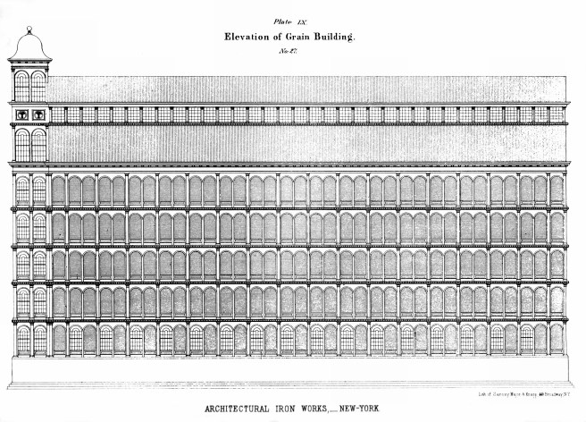 “As yet, I believe that no buildings in this vicinity, built purely for storage purposes, have been constructed entirely of fire-proof materials, except the St. John’s Depot of the Hudson River Railroad Company. [Designed by John B. Snook, who would employ the young John Wellborn Root just prior to Root’s interview with Wight two years later.] I am not aware that any attempt has been made in these buildings to stop a conflagration among the goods on storage either by horizontal or vertical compartments. The floors, to be sure, are of iron and brick, non-combustible, but with hoistways; and it is not difficult to conjecture, even supposing that all horizontal openings and iron shutters were closed, what would be the result of a fire raging on one of those floors, hundreds of feet in expanse.”