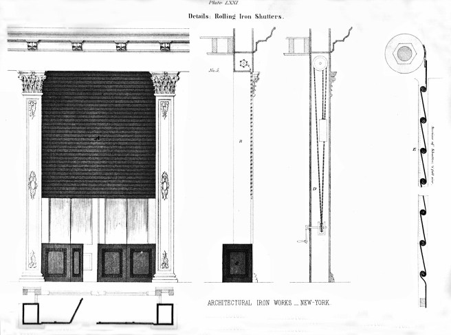Great sums of time and money were spent on the development of fireproof floor systems and enclosures such as iron shutters for windows (note the conflict in their function: “you must open your shutters when you want light.”) The shutters typically consisted of double sheets of iron separated by an insulating air space that were secured inside of the window frame to iron fames built into the brick work.