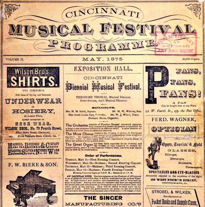 Following the finale of Cincinnati’s Third May Festival, Maria Nichols and her husband pulled off another coup: they incorporated what would become the famous Cincinnati College Conservatory of Music and offered its directorship to Thomas, who accepted the post on August 2, 1878, resigned as the Conductor of the New York Philharmonic and moved to Cincinnati.