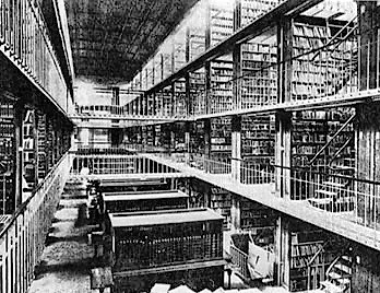 Shillito’s desire for openness and unobstructed views in each floor, as manifested earlier in McLaughlin’s 1857 building, required McLaughlin to support all six floors on a framework of iron columns and beams without the aid of any interior bearing walls. The drawing of the iron structure above indicates that for fireproofing the column and the bottom flanges of the beams were encased in plaster. The floor structure employed heavy timber joists with wood decking. In fact, Shillito’s desire for openness and unobstructed views in each floor was also manifested in the design of the shelving and display cases which were kept to a maximum height of four feet, six inches.