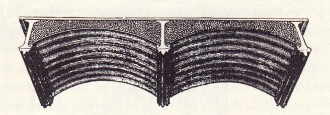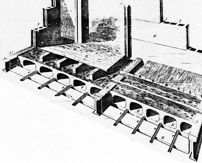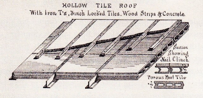 Before George Johnson had been forced by the recession to return to New York, he had developed a system similar to his hollow, fireclay tile arches to fireproof wood joists, that evidence suggests that Sanford Loring’s Chicago Terra-Cotta Works had manufactured these that were first used in the roof of the new Chicago Water Works in 1873, where the terra cotta tiles were laid between inverted T-irons.