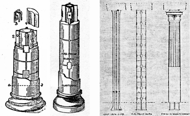 The essence of the Chicago skeletal-framed skyscraper that evolved during the second half of the 1880s (i.e., “Chicago construction”) was that the iron frame supported its exterior masonry envelope, especially the fireproof covering of the column, completely on the iron frame, thereby relieving the masonry from any load-bearing function. As the Drake and Wight column was the first successful example of a fireproof covering being mechanically attached to an iron column, it is appropriate to note that the Chicago iron skeleton frame had been officially born in October 1874. Its father had been Peter B. Wight. Therefore, Chicago’s fireproofed iron frame was developed not in response to the 1871 fire, as usually stated, (nor by John Van Osdel in the basement of the Palmer House) but instead as a direct response to the threat to discontinue the use of iron columns and the reality of the cancellation of all fire insurance policies throughout the city in October 1874, by the National Board of Underwriters whose actions had resulted from the second fire on July 14, 1874. Peter B. Wight’s application of a thin surface of Sanford Loring’s porous terra cotta to the iron skeleton frame would reduce the function of masonry in a building from load-bearing to that of only fireproofing (and enclosure) that resulted in a lightweight structural system that could finally overcome the limits of Chicago’s weak soil that would unleash the skyscraper to grow in Chicago beyond the traditional height limit of ten stories, once the economy rebounded following the Great Depression of 1873-79.