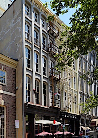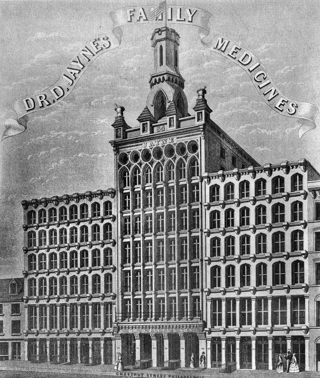 The eight-storied Jayne Building, designed by William L. Johnston and Thomas U. Walter in 1849 with its 130’ tall tower, was the most expensive of these. This image of the Jayne Building best exhibits the language of continuous vertical piers and recessed horizontal spandrels of these structures, as well as the contrast between how this building’s façade is read with its slender verticality versus the layered horizontality of the walls with window punctures to either side of it.