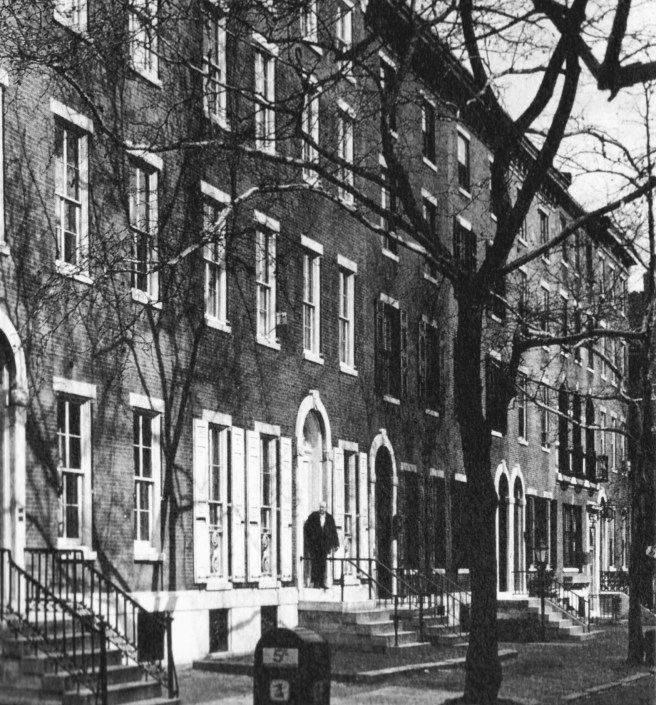 “Philadelphia dwellings are not so “architecturesque” as the corresponding quarters of New York. The carefully wrought Doric order enclosing the front door, and the bits of moulding and carving over the windows, are absent. The lintels are plain slabs of white marble flush with the wall. The old-fashioned elegance is abolished, probably by Quaker feeling, into a simplicity which is only bareness, and becomes very tiresome. The one element of exterior effect which is striven for in the typical Philadelphia dwelling is cleanliness.”