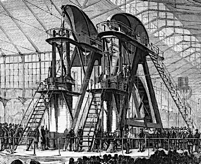 The Fair’s second largest building, the Machinery Hall, housed the largest steam engine at that time, constructed by George H. Corliss. The 40’ high dual engine provided power for the entire complex through a series of 75 miles of belts that drove shafts whose length exceeded one mile. The Corliss engine was started by Brazil’s Emperor Dom Pedro II, with Pres. Grant at his side, as the final event of the opening day ceremonies on May 10. While the design of the Fair’s grounds and its buildings have little interest for our study, some of the proposed exhibits as well as some of the buildings erected in advance of the Fair do have importance for us to study and appreciate.