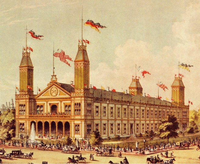 While Philadelphia had provided the young Root and Sullivan with inspiration, it was Chicago’s old rival, Cincinnati that would erect actual buildings in competition with Chicago, that Chicago, once the Depression began to let up, would first copy, and then, in order to remain “the biggest,” have to surpass (examples included the use of Venetian gondolas in the 1893 Fair that Cincinnati had first used in its 1888 Centennial Fair). Cincinnati was like Philadelphia in a number of ways. It had been the largest city in the West, until the “Windy City” finally boasted in 1868 that its population had surpassed that of the former “Porkopolis.” (However, westward expansion had continued during the war and St. Louis’ population had actually surpassed that of Cincinnati before Chicago’s had, so that even by 1870, St. Louis’ population was 310,860 while Chicago was still second in the West with 298,977. Chicago would not become the largest city in the West until a few more years after the 1871 fire.) Cincinnati had also always been the nation’s pork-packing capital, nicknamed “Porkopolis,” until the war had also altered the markets in favor of Chicago.