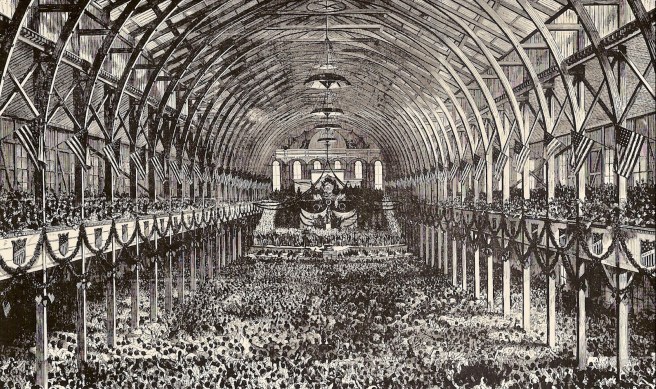 Paralleling Cincinnati’s business community’s side of the dual equation of Art-and-Industry had been the city’s cultural community, driven by the city’s dominant German population and its commitment to the musical traditions of the mother country. Chicago also had a large immigrant German community, and the two groups were often engaged in a “friendly” competition that reflected the larger civic battle being fought between these two Western cities during this period. Cincinnati was home to the national headquarters of the international German singing society Nord-Amerikanisches Saengerbund that was planning to host its annual convention in the spring of 1870 in Cincinnati. The local Germans had acquired from the city a vacant site across from Washington Park but had little money for the festival, while the Exposition directors had the funds but no site, so the two groups agreed to combine their respective resources to build the Saengerfest-Halle that was ready in time for the Festival’s opening day of June 15, 1870.