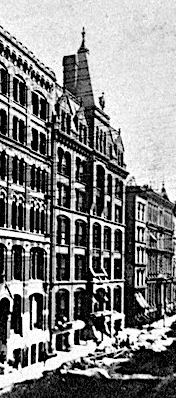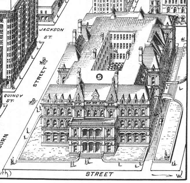 At the same time, September 1880, the Brookses decided to add two floors to the adjacent Portland Block, whose design followed neither Jenney’s original design nor the new rectilinear language of his Leiter Building, which leads one to speculate which architect Aldis had hired to design of the addition. Meanwhile, across Dearborn at the southeast corner with Washington, the Kendall Building was also finally acquiring two additional floors that it was to originally have had ten years earlier because: