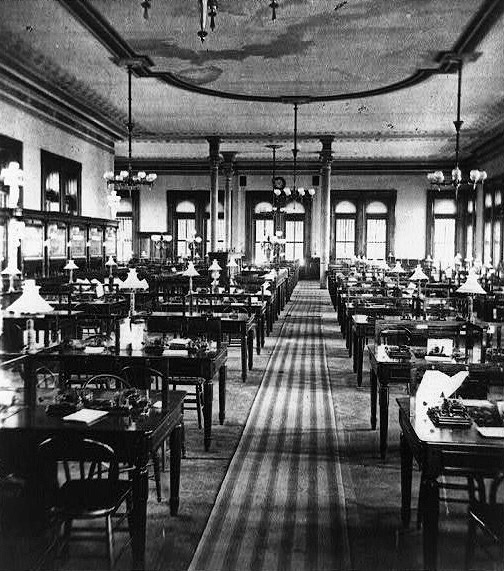 Post located the space dedicated to the telegraph operators at the top of the building apparently for two reasons. First, as the telegraph wires were hung in the air from poles, it would be easier to bring the wires into the building at a higher level, without any potential conflict with the traffic in the street. Second, locating this huge space on the top floor meant that it could be virtually free of columns and walls, as there was no need to extend the building’s interior structure into this space because it could be spanned with deep trusses between the exterior walls.