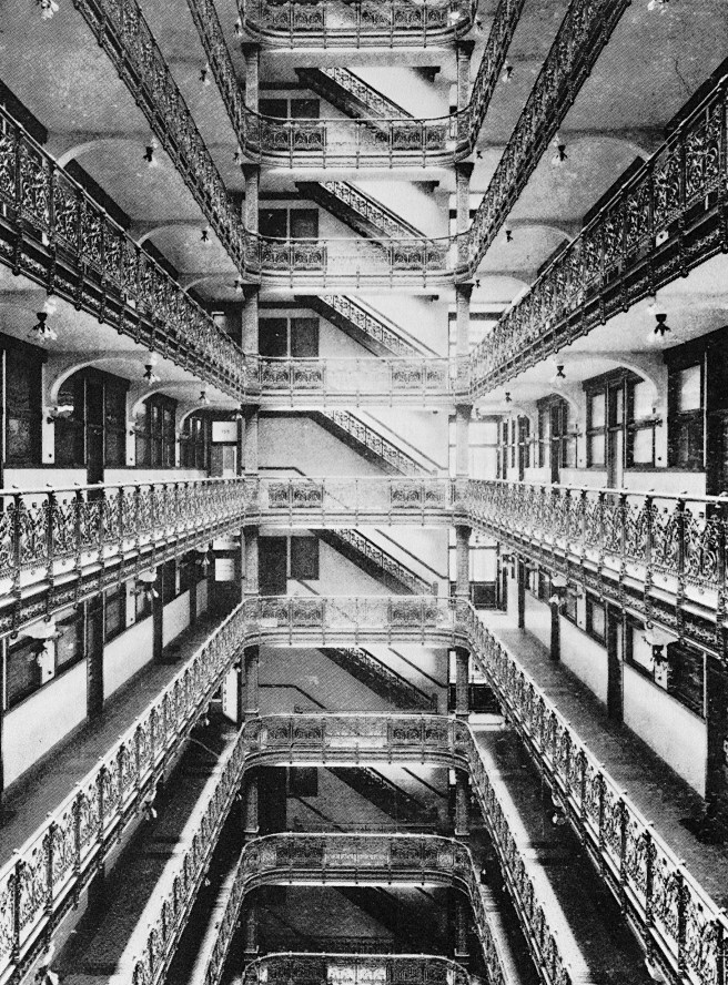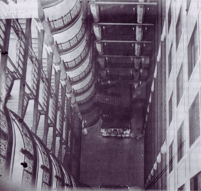 Any distance more than 25′ away from a window was simply too dark to support any effective human function. There was no option; the lightcourt was a necessity in a building up to the early twentieth century. (A sidenote: when John Portman’s Regency Hyatt House first opened in 1967, newspapers and magazines called its interior atrium “futuristic.” This, most likely, was due to the fact that most of these 19th century buildings that had atriums had been demolished to make room for even larger buildings. In other words, an entire generation had grown up having no idea that the interior atrium was a traditional component of a building, having been made obsolete with the advent of fluorescent lighting and air conditioning.)
