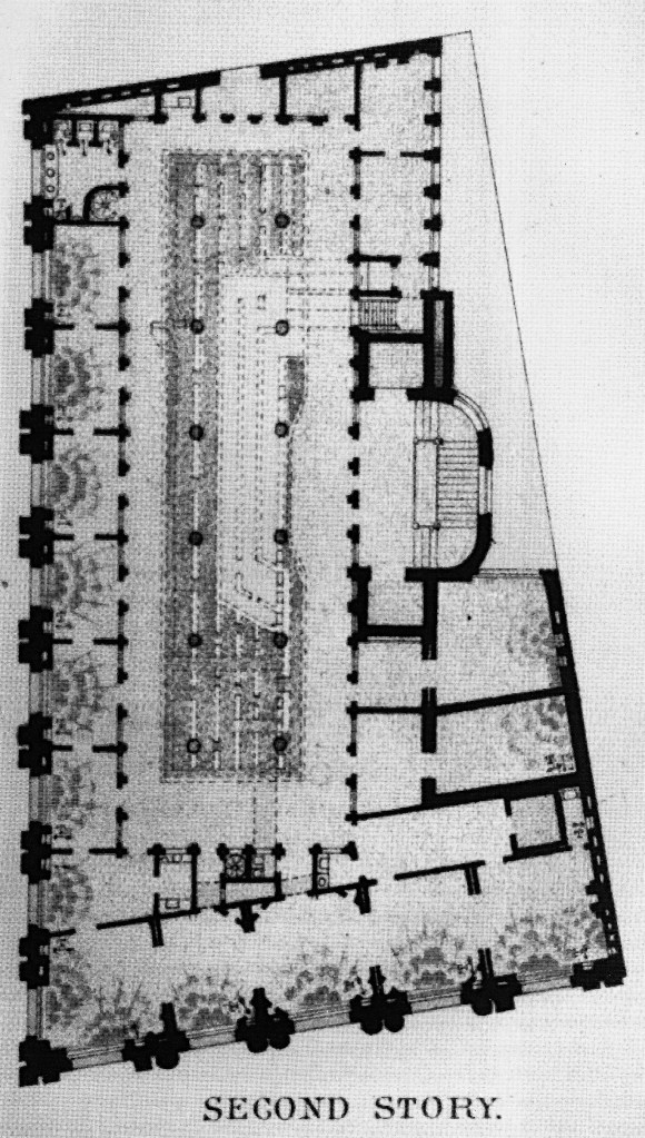 What historians, including William Birkmire, Sarah Bradford Landau, as well as myself, have been unable to definitively determine is whether there was a second skylight at the roof that would have weatherproofed the skylight over the banking floor. If there was, then the perimeter of the atrium at each floor could have been open balconies that lined the atrium. If Post had determined that he needed as much daylight as possible to penetrate down to the banking floor, he would have left this skylight open to the sky above, meaning that he would have had to enclose the corridors around the lightwell with walls and windows. A close-up image (at the start of this post) through the lower skylight of a photograph taken after 1889 reveals an exterior wall with windows lining the atrium. However, this wall may have been a later addition based on Post’s detailing in the 1881 Produce Exchange. (If the wall was part of the original design, it would have been the prototype for the detailing in the New York Produce Exchange: see later chapter.) I will return to the construction of this wall in the next chapter on ‘Firmness.”