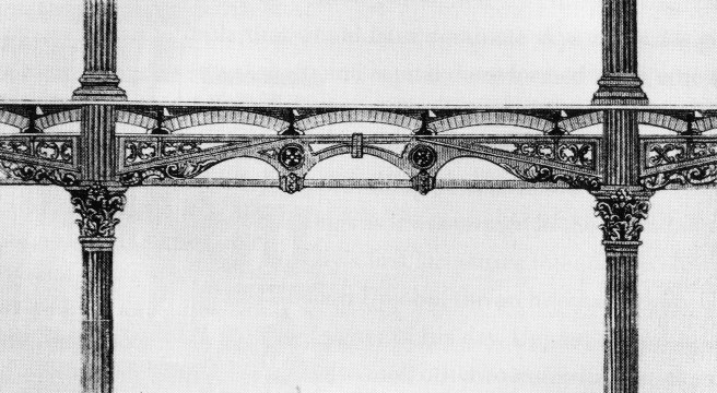 In the last chapter I noted that Equitable had required in the competition program the inclusion of the two-story banking hall. Historian Sarah Bradford Landau has shown that Equitable had complicated the design of this area, however, with the requirement for a mezzanine to surround the 35′ wide by 105′ long banking hall, so that the bank’s managers could observe from their mezzanine offices their employees on the Main floor under the skylight, as well as so that customers could look up and view the managers. The structural implication of this requirement was that the exterior masonry wall above the skylight that enclosed the offices above the mezzanine floor could not be continuous down through the banking hall, but would have to be supported by transfer beams either to piers or columns along the mezzanine so that it would open into the banking hall. The columns in the first two floors of the Equitable Building, including those in the banking hall that supported the exterior walls of the lightcourt above were cylindrical cast iron sections with a 16″ diameter. The twelve columns in the banking hall were covered in scagliola (an artificial marble appearance formed by mixing finely ground gypsum in a matrix that is polished after it has set). The floors were made of brick jack arches that spanned between wrought iron I-beams (no real change since the Harper and Bros. Building), that were supported on wrought iron girders that spanned between the columns.