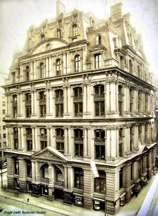 While Post was designing the Western Union, the unthinkable happened when Boston, that was considered to one of the country’s best-built cities, burned on November 8-9, 1872, with a similar intensity to that of the Chicago fire. While many professionals had expected Chicago, “the largest wooden city in the world” to eventually catch fire, almost everyone had been caught by surprise when Boston went up in flames the following year. With the conscious decision to shorten Equitable’s Kendall Building in Chicago following the 1871 fire, the Boston fire presented the company with alternate opportunity to build a larger version of the company’s pioneering experiment with the elevator that was not lost on Henry Hyde, or his father, Henry Hazen Hyde, who had been the head of Equitable’s Boston branch office since his son had decided to open its first branch outside of New York in 1863. The Hydes managed to assemble a number of small parcels on the block bounded by Devonshire, Federal, and Milk Streets, across from where the new Post Office was being rebuilt, upon which they had decided to build an even taller building than their original New York building. Arthur Gilman, who had conceived of the original design for the New York building, was commissioned to design, for all practical purposes what looked like a duplicate of his original 1867 design.