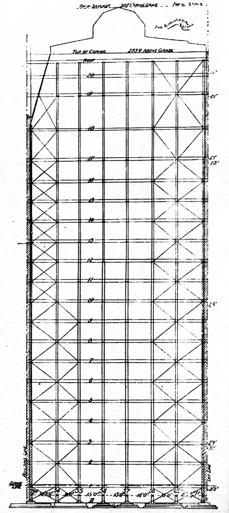 Burnham & Root, Masonic Temple, Chicago, 1890. Cross section showing the configuration of the diagonal bracing. Note the total height at the top of the building reads: 302’ 1.” (Engineering Record, January 21, 1893)