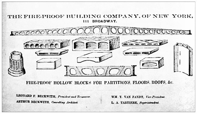 The other pioneer New York company was the Fire-Proof Building Company (FBC), formed by two brothers, Leonard and Arthur Beckwith. Although born in the U.S., their father’s business had taken the family to France where the two brothers had graduated with engineering degrees from the École Central des Arts and Manufactures (the same school from which Jenney had graduated ten years earlier) in 1868. While they were enrolled, they attended the 1867 Paris’ Exposition Universelle, for which their father was the U.S. Commissioner General. They were able to study the Fair’s construction exhibits that showcased the latest French flooring systems that augmented their education about such systems they had received at the École.