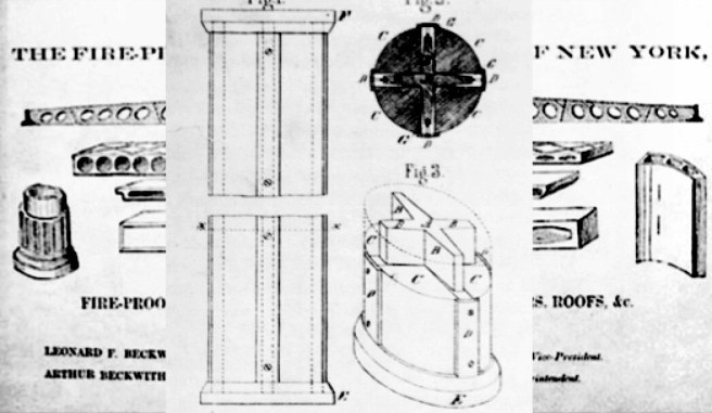 P. B. Wight’s 1874 Patent Drawing Overlaid (middle) on the FBC’s 1874 Poster. Compare his detailing vs. the two iron column fireproofing drawings at either side. (Landau, P.B. Wight; Wermiel, Beckwith)