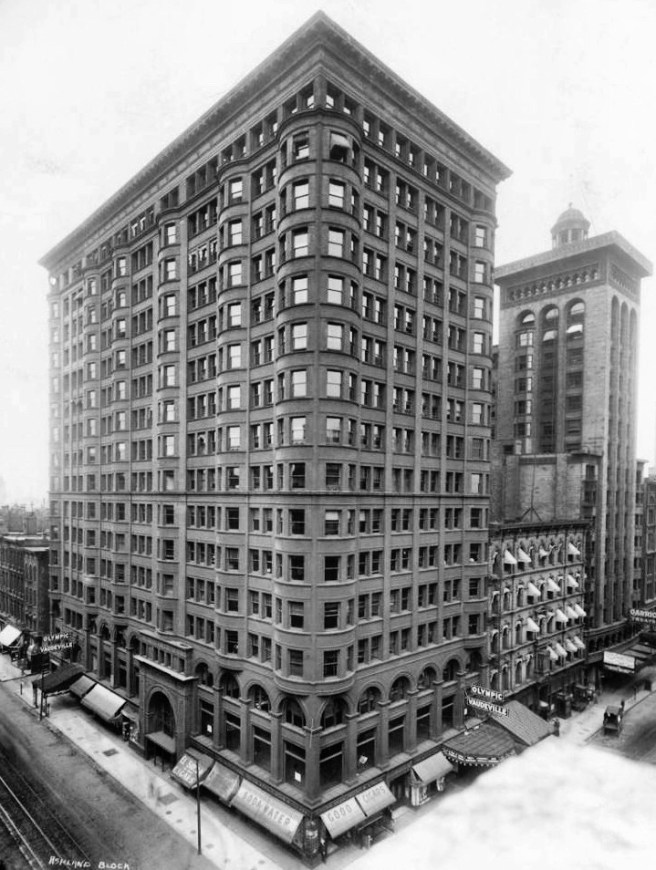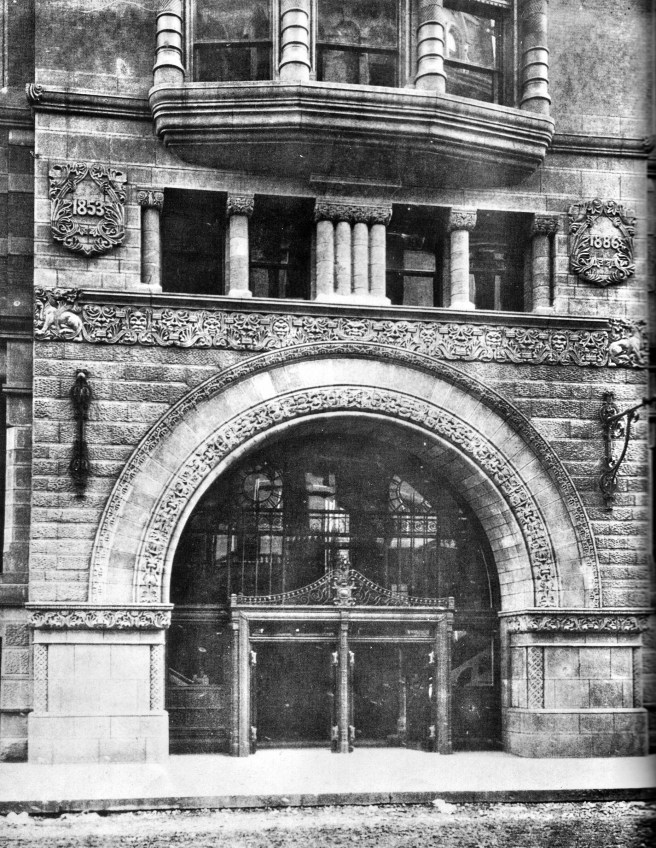 Well, this pretty much describes Root’s design process for elevations of the Phoenix Building. The details are exquisite, unfortunately just not coordinated into a coherent whole. In order starting with the base: a two-story stone base with flat-headed windows and square columns, third floor that is striped with alternating stone and brick layers in the piers (the columns from below are gone); floors 4-6 are grouped into a three-story arcade (the only use of arches other than the entry) whose location within the composition is totally meaningless; floor seven is a single story with square-headed windows; Floors 8-9 are grouped by two-story piers capped with a ornamented capital; a cantilevered balcony; and the top floor that is a two-layered rectangular grid, completely alien to the language of the floors below; capped with a tall cornice with a low-relief arcade running around it. Root needed to develop the discipline to unify the details from his witty, creative improvisations into a full-scale, harmonious composition, and this would come only with practice and thoughtful reflection.