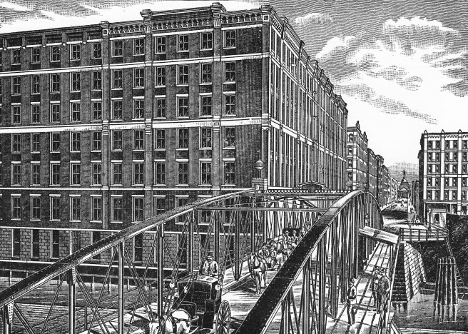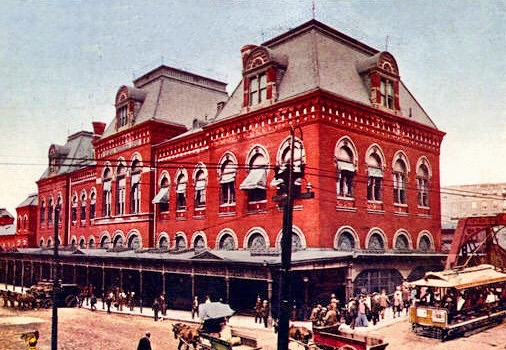 The new station was actually two stations built back-to-back: the CB&Q and the Milwaukee coming in from the north, while the Alton and the PRR came in from the south. Somewhat revealing, both these lines as well as the C&NW had chosen Boyington to design their post-fire stations, testifying to his professional reputation as Chicago’s premiere architect at the time. When Union Station opened in 1880, it made the western bookend for the emerging Adams Street corridor whose eastern bookend was the Interstate Exposition Building (that had also been designed by Boyington).