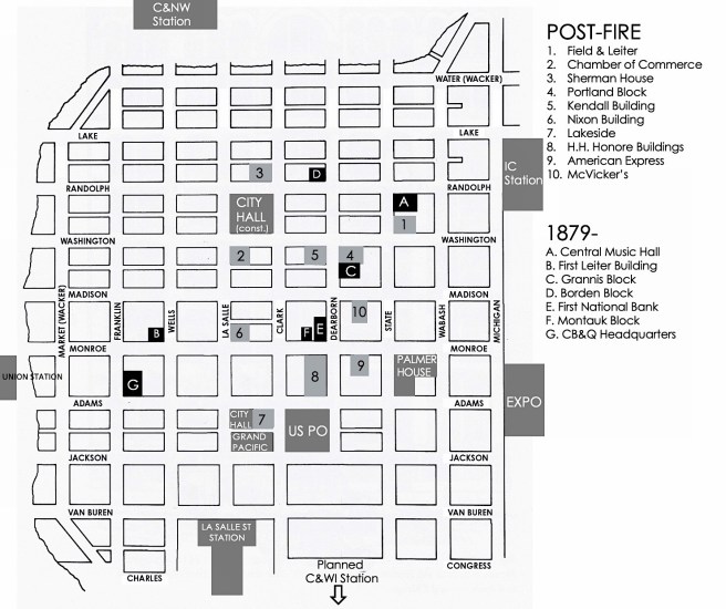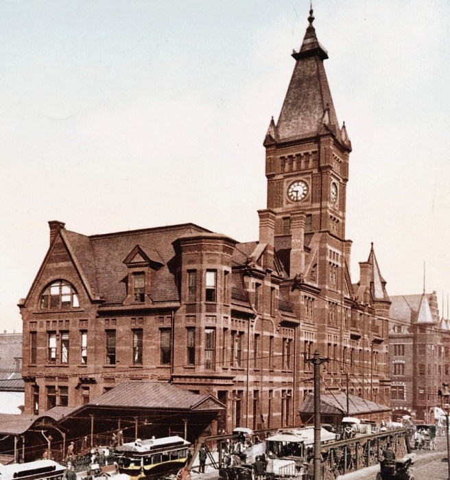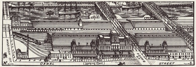 By 1874, however, Ogden was out of the management of the C&NW and while some political realignments had occurred, neither the Milwaukee nor the Burlington had any interest in using the NorthWestern’s station (that had been destroyed by the fire) and so joined forces with the PRR and the Alton to build the Union Station on the east side Canal Street, between Monroe and Adams (directly north of the existing PFW&C station so as not to disrupt operations).
