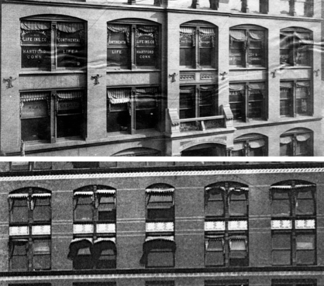 Apparently, the owners thought that the lowered first floor (basement) was not a highly marketable feature, for the Calumet had no raised basement: the ground floor’s two offices were a mere two feet above the sidewalk. The upper eight floors were the same in plan: seven offices so arranged that all of their doors were in view from the elevator shaft. In its construction, the Calumet was also more like the less extensive Grannis Block. Wood joist floors were supported by the exterior brick walls and an interior fireproofed iron frame. The wood joists were “fireproofed” with terra-cotta tiles that were supplied by Wight’s new competitor, E.V. Johnson’s Pioneer Fireproofing Company.