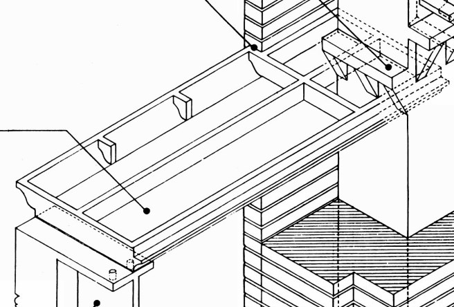 -Sixth, the exterior brick facing of the piers, whose thickness increased to 12 inches at the corner and entrance piers, was not supported on the iron column at any point, thus it was continuously bearing for eight stories from the granite piers. (remember that Jenney had notched the pans so that the facebrick could run continuous without any connection to the spandrels in an attempt to minimize cracking in the facebrick should the spandrel rotate caused by differential settlement). In fact, Jenney had gone so far as to specify a very conservative technique of bricklaying for the piers’ face brick to achieve a stronger-than-usual assembly to keep the cross section of the masonry piers to a minimum. Selected hard brick was used with a strong cement, not lime, mortar and was laid up in very tight, solidly packed joints. This would have been entirely unnecessary if Jenney was supporting the face brick on the iron frame at each floor. The importance of this point is that the concept of the iron frame is to completely support its masonry enclosure, which it definitely did not do in this building;