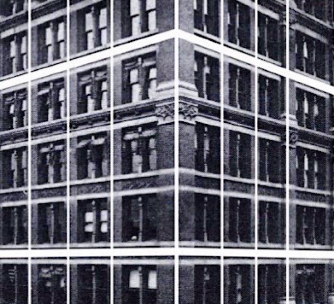 Admitting that the Home Insurance Building was neither the first skyscraper nor the first building completely framed in iron, then what “first-in-the-world” title is left for it to claim? (And why bother, other than for some civic boosterism on the part of Chicago?) I think the best that one might argue is that it was the first use of iron skeleton framing in the exterior of a tall building in Chicago? (Remember, Post had already accomplished this in New York.) Let’s examine this claim: that is, Jenney had used iron skeleton framing in the upper eight floors in the two street fronts.