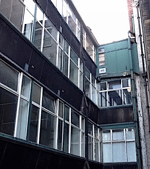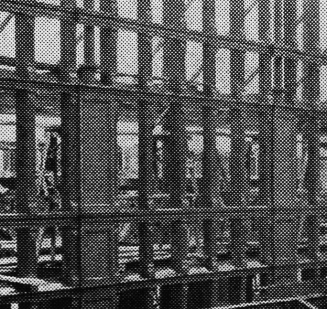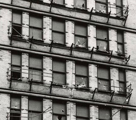 Burnham & Root, Phœnix Building. South (rear) elevation. Demolition photo taken by Richard Nickel in 1959. The windows behind the four elevators that were supported by iron skeleton framing. (urbanremainschicago.com)