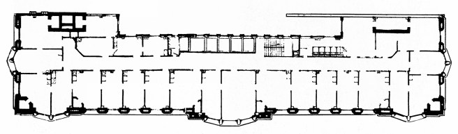And so we sill do just that. While the Jackson Street front was the longest elevation he had yet designed (216′ vs. the Burlington’s 199′), the site was only 46′ deep. The depth of the lot only permitted lining the three street faces with single-loaded offices in an elongated U-plan with a shallow lightwell in the rear (less than 10′ in depth) that allowed the addition of four more offices per floor.
