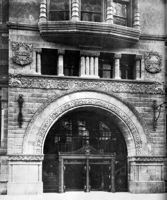 As construction of the Mallers Building paralleled that of the Insurance Exchange just across the street, it is inconceivable that Root did not take note of Flanders’ detailing. In June 1884, Burnham & Root were commissioned by a stock company headed by another of John Sherman Stockyard’s clients, Archibald McNeill, co-owner of the meatpacking company Libby, McNeill, and Libby, to design an office building on the block bounded by Jackson, Clark, and Pacific Streets.