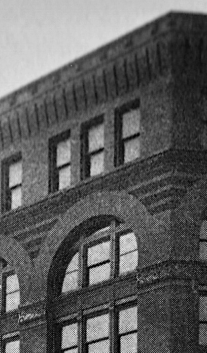 Root’s only significant departure in the design of the McCormick Building from its Boston precedent was his first experiment with the triple window, that was most likely inspired by Flanders’ Mallers Building, Chicago’s tallest office building. The visual appropriateness of detailing a triple window, rather than a double, under an arch is easily understood when one looks at this building. As opposed to all of the other arches in the McCormick’s exterior, Root used a double window under the arch in the entrance bay. Here, the center mullion is allowed to extend to the underside of the arch at its midspan, resulting in a visual support of the arch directly where an arch is supposed to be spanning. Hence, the arch’s structural integrity was completed eviscerated.