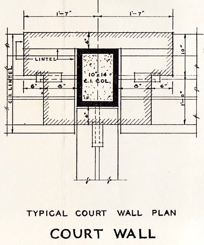 The only image I have located is this Rand-McNally view in which the nature of the light court walls is unfortunately hidden. I was lucky enough to find one of the floor plans that showed the actual cross-section of the piers in this façade. This dovetails perfectly with a drawing of this detail contained in the 1931 Field Report.